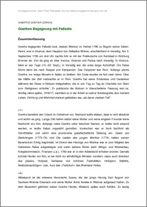 Nach einer einleitenden Darlegung des kulturhistorischen Rahmens von Goethes Begegnung mit Palladios Werken, bei dem besonders auf den in Weimar vertrauten Palladianismus von Dessau-Wörlitz hingewiesen wird, geht es hauptsächlich darum nachzuvollziehen, auf welche Weise Goethe Palladio begegnete: Gemeint ist hier zunächst die grundlegende Geisteshaltung, die hinter den Urteilen zu Palladio steht: ein damals weit verbreiteter, gleichzeitig aber auch angefochtener Idealismus, der die Architektur sehr weitgehend von ihren praktischen Bedingungen (nicht aber aus ihrem geistigen Zusammenhang) löst. Zudem wird die spezielle Ausrichtung der Urteile ins Auge gefasst; es erweist sich, dass sie auf der damals aktuellen Architekturtheorie aufbauen, aber in Vicenza sonst noch recht vage bleiben, während sie sich nach dem Ankauf von Palladios Quattro libri markant zu präzisen Diskursen wandeln. Die Urteile zu zwei einzelnen Bauten werden besonders herausgestellt: Der Convento della Carità erfährt als unvermittelte Wiederaufnahme des antiken Hauses in der Neuzeit die höchste Würdigung; dagegen begegnet die Villa Rotonda wegen ihres perfekten Formalismus einer gewisse Reserve. Sie ruft bei Goethe den kindlichen Traum von einem Feenschlösschen hervor.