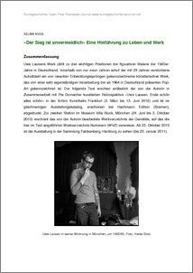 Uwe Lausens Werk zählt zu den wichtigen Positionen der figurativen Malerei der 1960er-Jahre in Deutschland. Innerhalb von nur neun Jahren schuf der mit 29 Jahren verstorbene Autodidakt ein von rasanten Entwicklungssprüngen gekennzeichnetes künstlerisches Werk, das von einer sehr eigenständigen Verarbeitung der ab 1964 in Deutschland präsenten Pop-Art gekennzeichnet ist. Der folgende Text erschien anlässlich der von der Autorin in Zusammenarbeit mit Pia Dornacher kuratierten Retrospektive »Uwe Lausen. Ende schön alles schön« in der Schirn Kunsthalle Frankfurt (3. März bis 13. Juni 2010) und ist im gleichnamigen Ausstellungskatalog, erschienen bei Hachmann Edition (Bremen), abgedruckt. Zur zweiten Station im Museum Villa Stuck, München (24. Juni bis 3. Oktober 2010) erscheint das von der Autorin bearbeitete Werkverzeichnis der Gemälde, auf das die hier im Text angeführten Werkverzeichnis-Nummern (WVZ) verweisen. Ab 22. Oktober 2010 ist die Ausstellung in der Sammlung Falckenberg, Hamburg zu sehen (bis 23. Januar 2011).